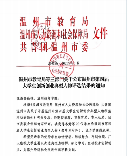 本网讯(团委、创业教育学院通讯员 淡小艳)近日,温州市第四届大学生创新创业典型人物评选结果公布,我校学生沈欣雨、于成芳成功入选。评选活动由市教育局、市人力资源和社会保障局主办,每两年评选一次,此次活动评选出13所在温高校共20位学生。