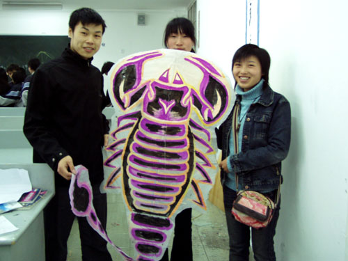 3月30日下午,紧张激烈的“风筝制作大赛”拉开序幕。比赛中,同学们充分发挥艺术专业特长,讲究创新创意,赋予风筝以丰富的文化内涵。不一会儿,同学们自己研制设计的形式各异的风筝就展现在面前,有色彩斑斓的抽象画,栩栩如生的蝎子老鹰,俏皮可爱的卡通人物,也有温文儒雅的诗词……这些风筝作品无不体现着同学们深厚的艺术功底,独特的设计理念。