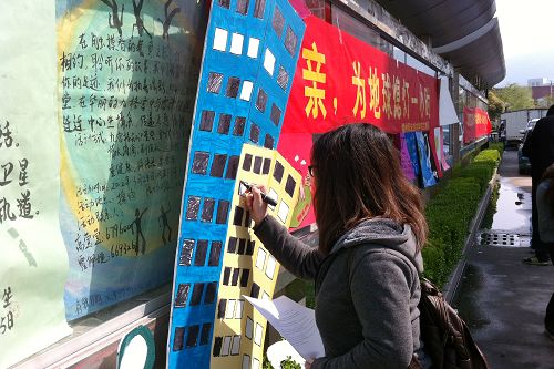 志愿者们给路过的同学分发“地球一小时”环保倡议书;每一名路过的同学都可以在“旅社守护者”志愿者队自制的“摩天大楼”上许下自己对环保的诺言——用黑色墨水笔将“摩天大楼”中的一面窗子涂黑,寓意着熄灯,为地球节能。