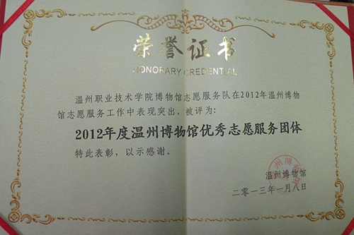 近日,温州市博物馆表彰2012年度温州博物馆优秀志愿者服务先进集体和个人,我院被授予“2012年度温州博物馆优秀志愿服务团体”荣誉称号。