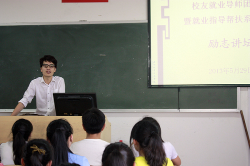 5月29日星期三下午15:30,优秀校友商英0702班班长应邀返校参加校友就业导师团聚会暨就业指导帮扶系列计划,此次励志讲坛在知行楼301开讲。通过邀请优秀校友介绍成功经验和失败的教训,畅谈工作中的酸甜苦辣。使广大毕业生产生共鸣,在学习、工作、就业中少走一些弯路,多一些理性和成熟。