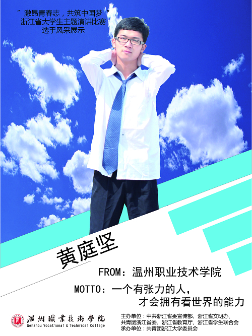 由省委宣传部、文明办、团省委和省教育厅主办,浙江大学承办的“激昂青春志 共筑中国梦”浙江省大学生主题演讲比赛,于3月底至6月初展开。我院学子黄庭坚同学凭借热情洋溢演讲和端庄的仪表,以演讲题目《河》,荣获校内选拔赛桂冠,进军省级复赛,经大赛组委会办公室审核和专家组评选,以优秀成绩晋级省级决赛。