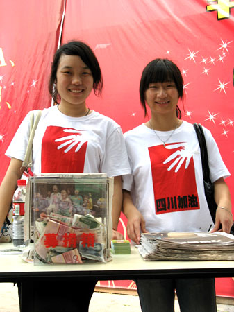 5月25日,温州商报在全市范围内招募义卖报纸志愿者,每份报纸50元起价,共一万份,并将义卖所筹得的捐款为四川灾区小朋友筹建一所“震不倒的希望小学”。商报65名记者及118名志愿者参加了此次义卖活动。我院财会系会计0708班的董亚蓉、马珍弟、黄志霞、张丹丹、夏俭威五名志愿者也幸运地被选中加入到了义卖志愿者的队伍。