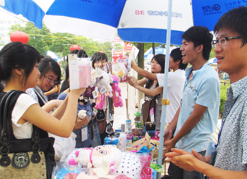 “展销会”上,“参展商”们的展品琳琅满目,大多都是贴近学生需求的日常生活用品、首饰、毛绒玩具、电子产品等,从产品采购到展位布置,从现场叫卖到讨价还价,大学生“老板”们各个架势十足。采访中一位参展同学表示,参与草根创业的出发点并不完全为了赚钱盈利,更多的是想通过这样的活动来体验创业的艰辛和乐趣,积累经验。看着自己精心准备的产品受到同学的欢迎,再累也觉得值。
