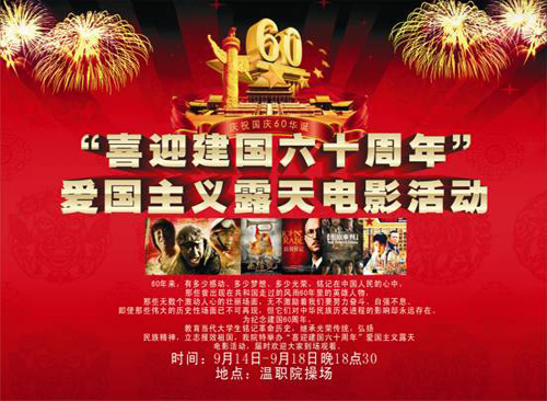 为庆祝新中国成立60周年,充分发挥校园文化活动的育人功能,唱响在中国共产党领导下走中国特色社会主义道路,实现中华民族伟大复兴的主旋律,促进校园和谐,营造学生健康成长的良好氛围,自9月14日起,院团委、学生会举办了为期一周的爱国主义电影展播活动,对当代大学生进行革命主义、英雄主义、爱国主义教育,帮助他们树立正确的世界观、人生观、价值观。本次展播活动还作为2009级新生始业教育的组成部分,丰富了始业教育的形式和内容。