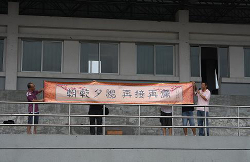 蔡后界处长与叶吉波书记共同展开题有“朝乾夕惕,再接再厉”的大型书卷