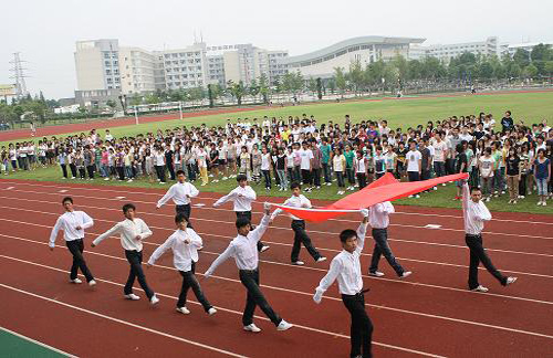 上午7:00,财会系09级全体新生、大二大三党员及入党积极分子共八百多人齐集学院体育场,井然有序地列队等待国旗升起的时刻。升旗仪式由出旗与升旗两部分组成,先由10名护旗手组成的仪仗队守护着五星红旗沿主席台走到升旗台,在全体师生的静立、注目礼中,3名升旗手将国旗冉冉升起。整个过程简洁、庄严、肃穆。