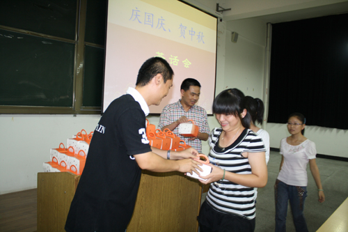 我系此次活动让身在异乡的莘莘学子在他乡观看到了我国新世纪的首次阅兵。“每逢佳节倍思亲”,恰逢今年中秋佳节,财会系团学组织还特意为该系来自外省的新生们送上一份额外的惊喜——中秋月饼,让大家在欢庆的日子里,更能感受到学院对他们的关心与体贴。