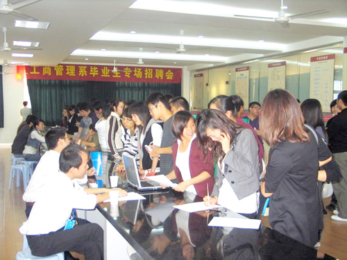 本次招聘会由工商管理系举办。招聘会从下午3:30开始,3家企业带着市场督导、营销代表、销售经理助理、仓库管理、行政文秘等100多个职位前来招聘。工商管理系2007级各专业学生及其它各系相关专业学生参加了应聘,其中有40多名学生被合作企业初步选中,将参加下一步的复试和培训。