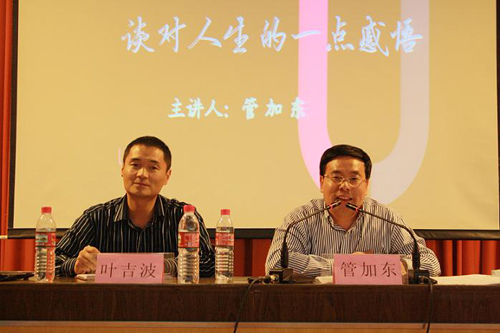 本次讲座以“谈对人生的一点感悟——一位会计人员的创业历程”为主题,管总结合自己对生活的感悟,对过去学生时代的经验总结,和同学们分享了自己在不同工作环境下不同阶层的成长经历和感悟。从“如何融入社会,如何做好财务工作,如何当好一个管理者,如何处理和员工和上司之间的关系,”等诸类问题谈人生观、世界观、金钱观、价值观、奋斗观、幸福观,分析成功要素。说到成功的三个条件——天资、勤奋、机遇时,管总希望同学们利用好自己的业余时间,比别人学的更快,把握好机遇,朝自己的目标奋斗进取。