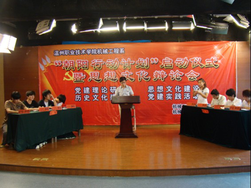 2010年6月2日下午14:00,机械工程系党建创新项目——“朝阳行动计划”在一号实训楼一楼演播厅顺利启动。温职院院党委委员、宣传部朱金荣部长,学工部苏跃飞副部长应邀出席本次启动仪式。机械工程系党总支黄加銮书记、机械系学工办老师、党员教师代表、学生党员、学生干部60余人参加了启动仪式。