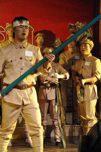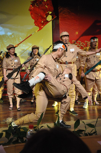 6月29日下午,在学院报告厅举行的“庆七一建党八十九年纪念大会暨“红色经典”文艺汇演舞台上,轻工系选送的情景表演唱《英雄赞歌》一出场就吸引了全场观众的目光,让所有的观众耳目一新:经过战火洗礼的战旗迎风飘扬、身穿中国人民志愿军服装的战士造型虽然身带伤痕但斗志昂扬、他们紧握手中的武器、目视远方; 英雄“王成”紧握爆破筒站立在队伍的前方;“王芳”的 “烽烟滚滚唱英雄” 一声即出,立刻就被全场雷鸣般的掌声所淹没,合声演唱“为什么战旗美如画,英雄的鲜血染红了她 ”再次激起了全场观众的共鸣。在整台情景表演唱演出的过程中,全场报以9次热烈的掌声,让演出现场的气氛达到了空前的高潮。在演出结束前的合唱“为什么大地春常在,英雄的生命开鲜花!”歌词时由于剧情的设计中有全体战士向中心靠近和组成三组造型,人们仿佛置身于当年那个硝烟弥漫的战场,全场包括7名评委在内都情不自禁的鼓起了雷鸣般的掌声,久久不息的掌声响彻了学院报告厅的上空。