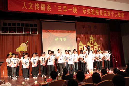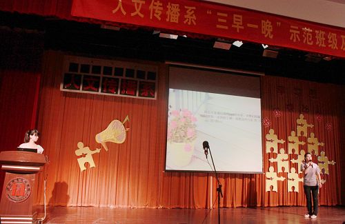 整场晚会分为三个部分:首先,系部对本学年在“三早一晚”活动中表现突出的示范班级和先进个人进行表彰;其次,各班级分别用PPT汇报的形式向观众呈现了班级在过去的一学年里所经历的精彩和辉煌;最后,各班级学生以其别出心裁的班歌形式演绎了他们对班级的热爱,展现了各自班级的风采。商英1001班和文秘1001班带来的《明天会更好》,用他们心中最真诚的声音唱出了他们对未来的美好憧憬,引起了全场观众的共鸣;文秘1002班带来的《我的舞台》充满自信地唱出了“我的舞台,我自己主宰”的雄心壮志。感人的解说和精彩的班歌,将评比晚会的现场气氛推向了高潮。经过紧张激烈地角逐,最终文秘1002班荣获本学年学习型班集体评比第一名的好成绩。