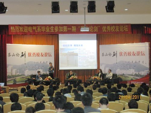 为帮助广大同学更好地认识自我,科学规划大学学习生活,树立正确的人生价值观,电气系于2011年4月21日下午,在信息楼报告厅召开首届“茶山论剑”优秀校友论坛。出席本次活动的嘉宾有系党总支书记晁拥军、系副主任苏绍兴,辅导员孙建华、张芳芳以及学生代表共500多人。