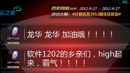 晚会在动感的开场舞以及主持人别具风格的装束中拉开帷幕。随后,一幕幕精彩纷呈的节目轮番上演。一首萨克斯演奏的《约定》轻灵而娴熟的节奏,气氛与音乐完美的融合,让我们恬静安详。小品《那些年》、《影子舞》、《音乐剧》等浓郁的童年气息让我们感怀岁月的流逝,更有歌曲《改变自己》、《对你爱不完》等激情澎湃的歌声,彰显着青春的活力。此次晚会的亮点不仅仅是晚会形式与主持人的装束与以往大不相同,更特别的是计算机系引入了最新短信互动平台,所有在场的观众可以通过发送短信,会场边设有一个投影幕,这些短信会出现在一个微博墙上,从一则则短信上看,同学们对此次的晚会表现出了极大的热情和认同。