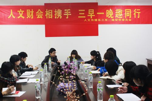 为了进一步做好财会系学生来人文系选择兴趣项目进行晚自修的工作,3月19日,人文传播系在实训一号楼414教室组织召开了“人文财会相携手 三早一晚趣同行”主题会议。
