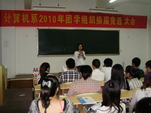 10月13日下午2点,计算机系2010年团学组织换届竞选大会在2号教学楼412教室举行。来自我系团学组织13个部门的40余位同学参加了本次竞选活动。系团学指导老师、系学生会主席、系团总支副书记以及各部门部长出席了本次竞选活动。大会由系学生会主席主持。