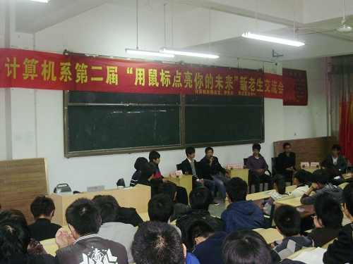 11月9日晚6点30分, 计算机系第二届 “用鼠标点亮你的未来”新老生交流会在2号教学楼101教室举行。系专业教师代表、计算机系及其他系优秀学生代表与计算机系全体大一新生参加了此次晚会。