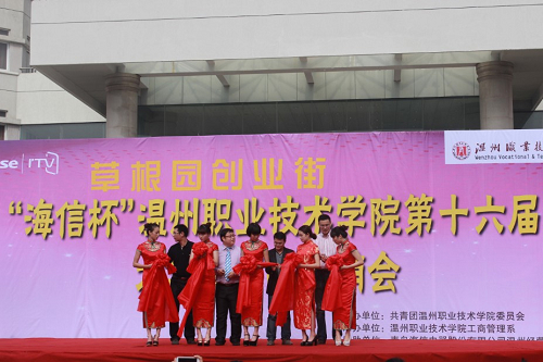 11月9日,温职院热闹非凡,“海信杯”第十六届大学生商展销会暨温州职业技术学院院草根园创业街于图书馆门前隆重开幕。此次活动是由院团委主办,工商管理系承办,海信温州分公司协办的大学生创业教育活动和具有校园特点的学生创业实践活动。工商系党总支书记李建中,院团委副书记刘海明,工商系学工办主任林香港,海信温州分公司总监周靖宇,出席了开街仪式。
