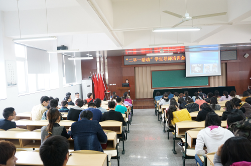 为进一步提升我院“二早一活动”学生导师的综合素质,表彰上学期表现突出的“二早一活动”十佳学生导师和先进个人。学生处于3月19日下午在崇学楼101室举行了“二早一活动”学生导师培训会暨十佳学生导师、先进个人表彰大会。学生处处长、团委书记叶吉波,各系学工办主任、相关辅导员出席,全院近200名学生导师参加,会议由学生处副处长吴冰主持。