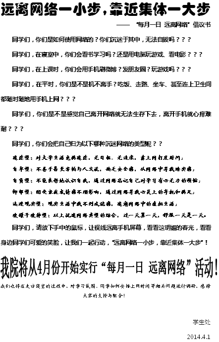 活动现场,同学们积极参与,在横幅上签上自己的名字,以此响应学院“远离网络一小步 靠近集体一大步”、“每月一日 远离网络”的号召,除现场签名、发放倡议书外,我院还将结合教师走访寝室,关于网络使用情况进行调研,了解学生对网络生活的看法及现状。