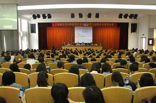 杨晶晶老师作为主持人向大家介绍到场嘉宾并请田正主任发言。田正主任向到场同学介绍了暑期社会实践的概况并鼓舞同学们要发挥自己的特长,全面提高自身能力,更联系实际、形象生动的提醒同学们在实践中应注意的文明礼貌和自身安全问题。接着郑国波书记向大家介绍我院不同与其他院校的“三进一留”的特色模式和暑期社会实践中的各项要求、环节。会议最后播放了人文传播系传媒专业特别制作的《暑期社会实践安全教育视频》,强化学生的安全意识。