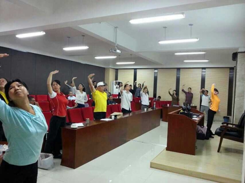 吴老师主要围绕“什么是健身气功”、“为什么选择健身气功” 、“健身气功有什么健身功效”等问题展开讲解,健身气功主要包括五禽戏,六字诀,八段锦和易筋经四种。为让大家有个直观的了解,吴老师以东汉名医华佗根据虎、鹿、熊、猿、鸟活动特点编创的五禽戏为切入点,深入浅出地阐述了健身气功对生理机能、身体素质及心理状态产生的积极影响,并指出长期习练可改善心血管和呼吸机能,体力增强,有效提高心理健康水平。吴老师的讲解引起了老师们的极大兴趣,大家全神贯注地跟着吴老师一招一式地学习五禽戏。讲座结束后老师们纷纷表示,自己从对健身气功一无所知,到领悟到运动、呼吸和心理三者和谐统一的重要性,是一次难得的学习机会。