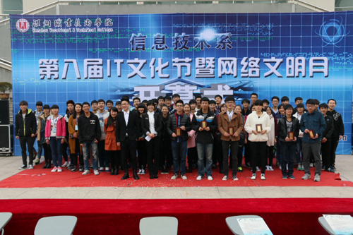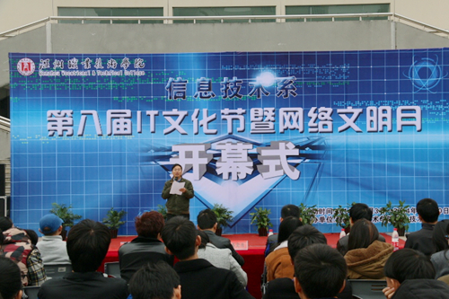 12月3日下午,由信息技术系举办的第八届IT文化节暨网络文明月开幕式在体育馆前隆重举行。系党总支书记童炳金、团总支书记罗小阳、实训科科长张浩等老师参与了此次活动。