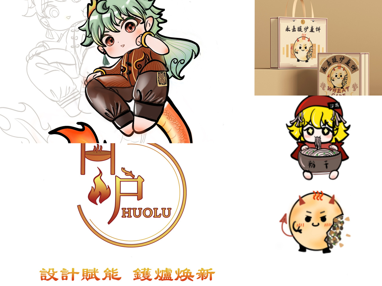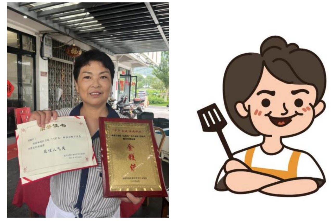 以镬炉村的非遗文化为底色,以沙岗粉干厂厂长黄阿姨为原型,团队设计创造了一个兼具其外观特征与精神内涵的卡通IP形象。该IP形象身着传统围裙,手持象征荣誉与传承的金镬铲,突破传统粉干品牌刻板印象,以年轻化的审美表达与主视觉系统设计,结合慢直播等形式,成功推动乡土文化从静态陈列转向动态传播,从小众圈层走向大众视野,实现文化生命力的当代延续。目前,IP形象广泛应用于符合市场需求的特色非遗产品及农产品,实现设计要素反哺乡村,形成“各美其美、美美与共”的产业文化融合生态,为乡村振兴与共同富裕提供了强劲动能。