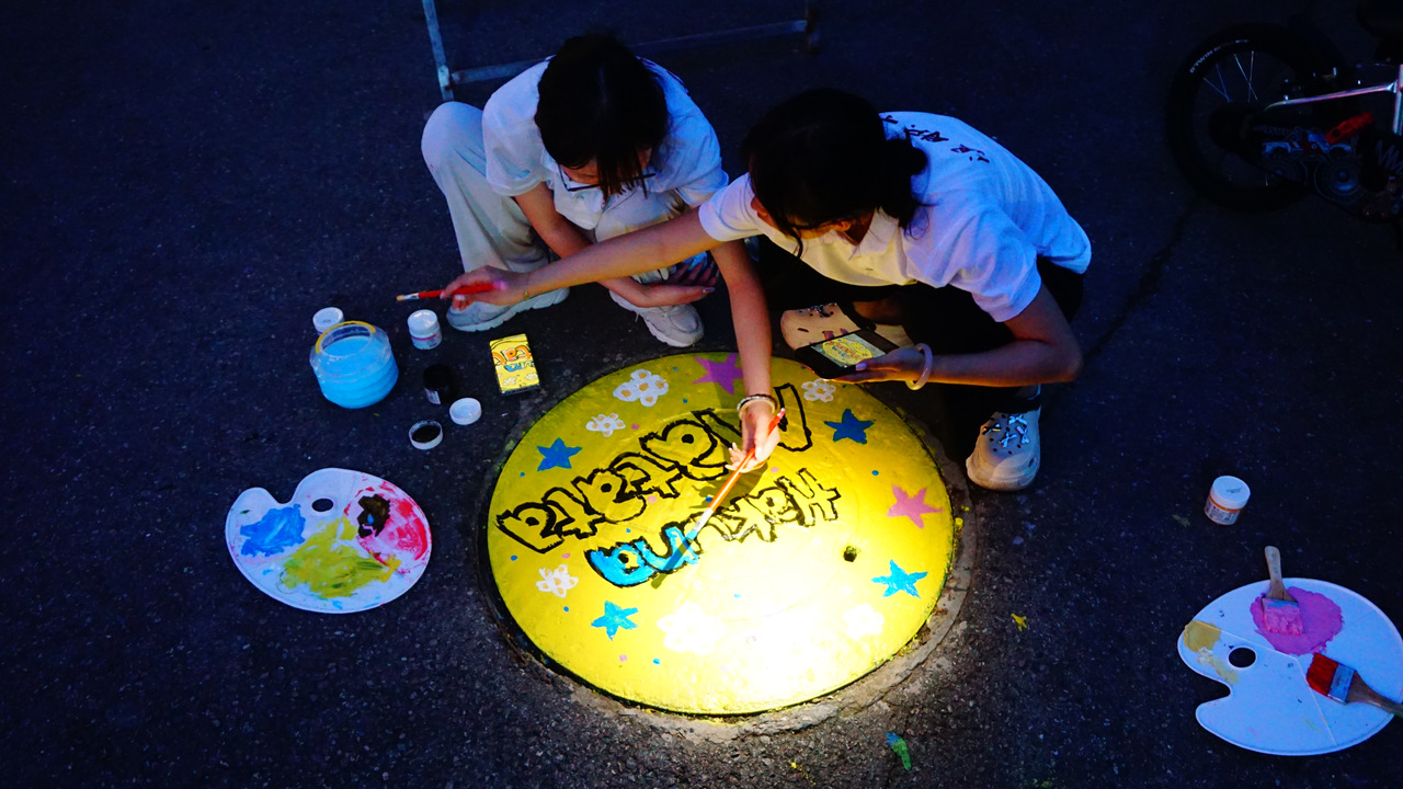 师生团队通过采访乡村CEO村支书等人群,深入了解该村通过全域环境整治、生态景观建设与长效管护,实现从“挂牌村”到“美丽乡村”的华丽转身,成功跻身全国美丽休闲乡村推介名单的奋斗历程,进一步加深对“绿水青山就是金山银山”理念的理解。在夏志良的指导下,实践队成员带领村里的孩童拿起画笔,紧扣青山绿水主题绘制多彩井盖,将平凡井盖变为展现镬炉村风貌的“文化画布”,既美化了村容村貌,更赋予了乡村公共空间独特的文化内涵。