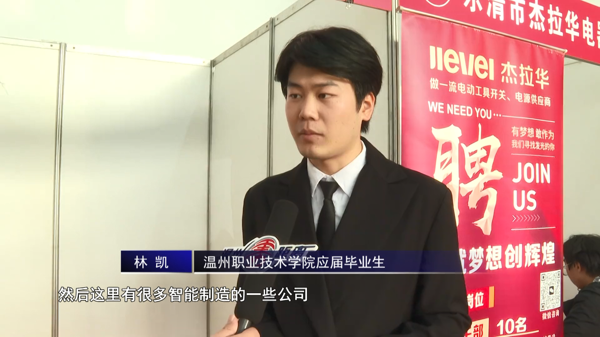 温州职业技术学院应届毕业生 林凯:(招聘的岗位)大部分都是跟我的专业符合,因为本人是电子信息工程技术专业的,然后这里有很多智能制造的一些公司,而且都是比较优质的公司到这里来招聘。然后这些比如说乐清市的这种最新的人才政策对待我们就是很优化,然后很符合我的专业。