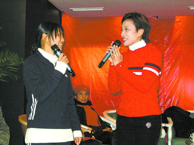 图为我院小戏迷(左)与著名越剧演员吴凤花现场交流。