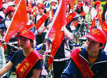昨天,温州职业技术学院分院团委组织100名志愿者,骑着自行车在市区发放创建文明城市倡仪书,呼吁市民从我做起,创建文明城市。