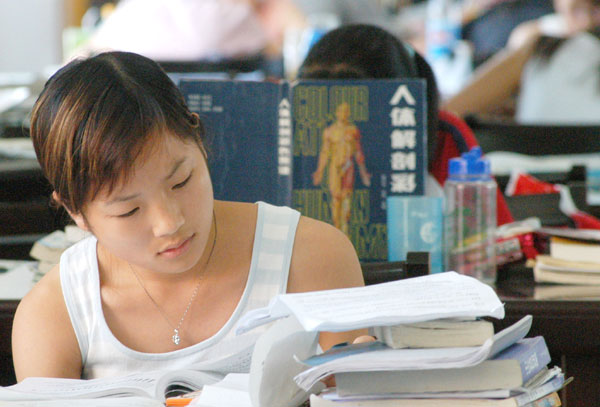 当天下午,在温州医学院图书馆七楼自习室里,坐满了几百名自习的学生。图为临床医学专业大三学生孙素娥在认真学习。