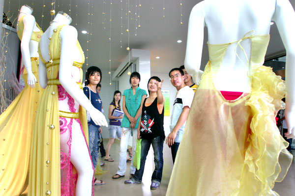 昨天下午,温州职业技术学院2005届毕业生毕业设计作品展在该院的图书信息中心举行,几名学生穿上了自己设计的服装站在展台上展示,赢得了一片赞誉声。