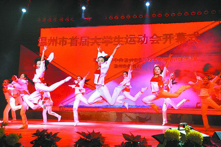 生命因运动而精彩,青春因运动而勃发。温州市首届大学生运动会昨晚在茶山高教园区大学生演艺中心开幕。市委副书记赵一德、市人大常委会副主任陈莲莲、副市长钱成良、市政协副主席王成云等与来自温州7所高校的学生代表千余人参加了开幕式,赵一德宣布开幕。