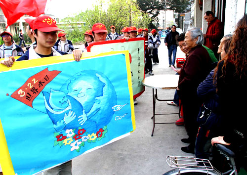 温州职业技术学院大学生拿着自己绘制的宣传牌,沿温瑞塘河一路开展“珍惜水 保护水 从我做起”宣传,吸引了众多村民的目光。