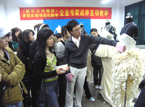 邵依苗和胡亚迪结合自己对温州礼服市场的了解以及多年积累的专业知识,在课堂上对温职院服装0601班学生设计的30多款生日礼服一一进行了点评,让学生们大开眼界,对礼服设计有了更直观的了解。