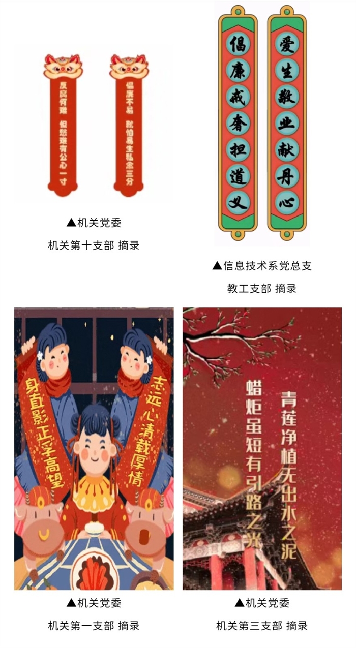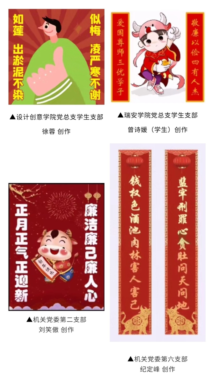 楹联,是我国传统文化一大精粹。一则构思巧妙的廉联,既能反映出廉洁思想,又能传递廉洁从政的价值导向,给人以启迪和警醒。温职院纪委举办的读廉敬廉荐廉联活动,旨在让师生党员利用假期闲暇时间学廉言、读警句、近文化,通过党支部微信群等载体互荐互学廉洁主题的对联,营造读廉敬廉、清廉过节、欢喜过年的良好氛围。