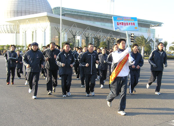 2005年1月1日清晨,我院80名教职工参加了由市委、市政府主办,市体育局等10家单位协办的“温州市元旦健身跑”活动。沐浴着新年的第一缕曙光,我院教职工在党委书记、院长周锦成带领下脸上都挂着微笑、写着豪情,大家迈着矫健的步伐,喊着口号向前奔跑,这正预示了我院将在学院党委班子的领导下在新的一年中迈着坚实的脚步,昂首挺胸地向着希望、向着胜利奔跑。