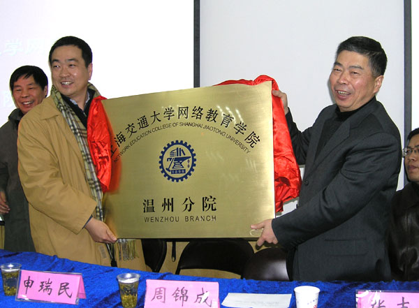 随后,还举行了隆重的授牌仪式,申瑞民教授把一块沉甸甸的、上面刻着“上海交通大学网络教育学院温州分院”牌匾递到我院周院长手里,这预示着上海交通大学网络教育学院首个校外分院在我院正式挂牌成立,也同时标志着我院与上海交通大学等国内知名院校的合作将进一步加强。