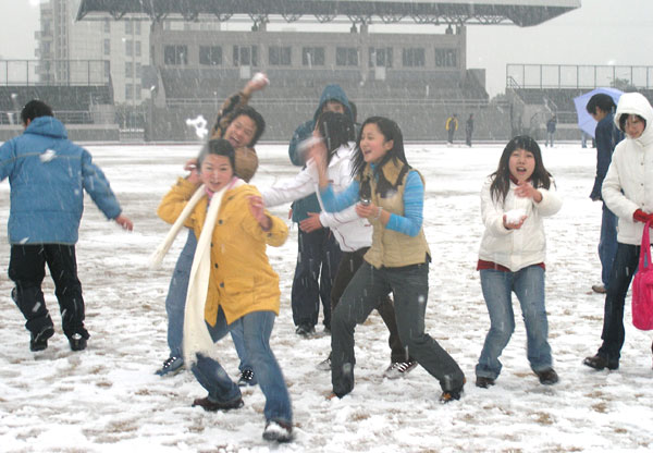 1月13日,当同学们从被窝里钻出来的时候,窗外是一个粉装玉砌的世界,美丽的大学城校园披上了一件银装。纷纷扬扬的雪让温职院校园到处洋溢着欢乐的气氛。同学们在欢乐中尽情展现出青春活力,打雪仗、堆雪人让稀罕雪的南方大学生尝了一回鲜,过了一把瘾。这一场2005年下的第一场雪却在温职院校园到处都透着“暖意”——