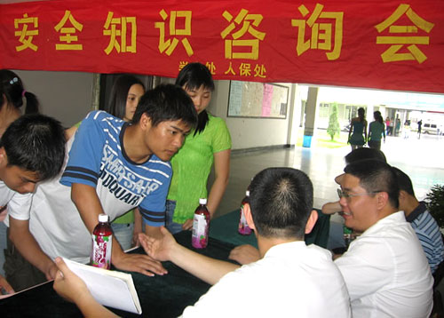 6月8日下午,学生处和人保处联手在学院社区开展了安全知识咨询会。在咨询会现场,学院学生处处长季凌斌、人保处副处长赵清弟以及温州高教园区派出所与交警四大队四中队的民警针对交通安全知识、消防安全知识、户籍管理知识等一些安全问题解答了前来咨询的学生,并提供了温州高教园区派出所的报警电话。同时,校园内还展出了近30张刑事和交通安全案例的宣传海报,并通过VCD播放了消防安全知识和急救知识。这次咨询会的开展,增加了同学们的安全防范知识,提高了同学的的安全意识。