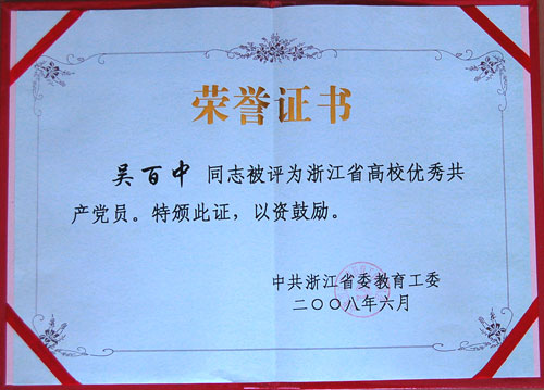 日前,浙江省委教育工委隆重表彰了一批全省高校优秀共产党员,我院机械系主任吴百中同志被授予“浙江省高校优秀共产党员”称号。