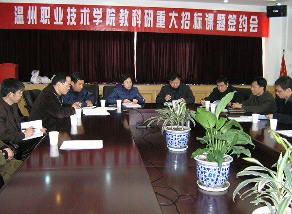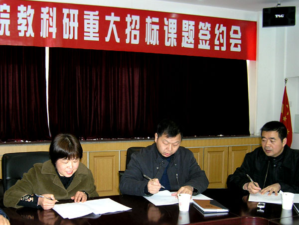 2006年3月3日,学院举行了教科研重大招标课题签约会。会议由教务科研处副处长南秀蓉主持。会上,吴金法副院长代表学院和七位立项课题的负责人签定了合同。吴院长要求各课题组负责人按合同约定认真组织实施,在实践中不断深化研究内涵,通过两到三年时间的改革和创新实践,按时保质完成课题研究和实践任务,并以此为载体推动教育教学改革向纵深发展。