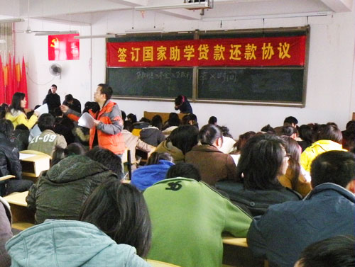 12月24日,我院在2号楼202教室举行学生诚信还贷签字仪式,学生处组织了200多名已经办理国家助学贷款的大学生在“国家助学贷款还款确认书”上郑重签下了自己的名字,承诺将如期偿还贷款。这将成为他们毕业后的第一笔信用记录。