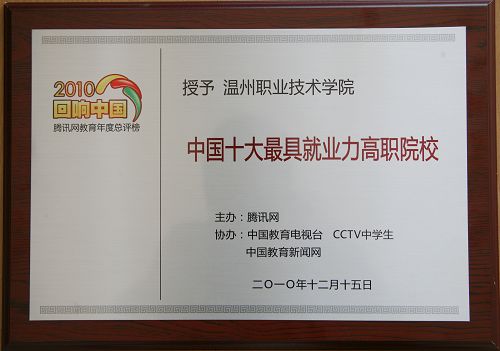 12月15日,由腾讯网主办的2010“回响中国”教育年度盛典在北京香格里拉酒店隆重举行。全国教育界专家学者、媒体人以及最知名教育机构领军人物400余人汇聚一堂,共同回顾中国教育发展历程,见证教育改革成果,树立中国教育榜样力量。温州职业技术学院荣获“中国十大最具就业力高职院校”称号。