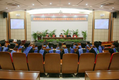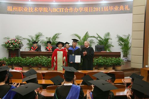 6月30日,我院2011届中加合作办学班毕业典礼在多功能报告厅举行。BCIT机械、电子、工业生产学院院长Trevor Williams、国际学院院长谷丰,我院副院长王向红、教务处处长王志梅、机械系系主任吴百中出席典礼仪式。这是我院毕业的第二届中加合作班,共有38名学生成功取得温职院颁发的大专毕业证书和BCIT授予的国际大专文凭,即“双专科文凭”。