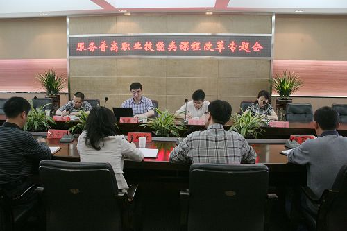 4月24日下午,我院在三楼会议室召开服务普高职业技能类课程改革专题会。温州市教育教学研究院院长潘建中、副院长施雪云、教研员方瑞光、沈清,我院院长丁金昌、副院长王向红、高等职业教育研究所所长张宝臣、教务处副处长唐高平、成教学院副院长欧阳翰夫等出席了本次专题会。
