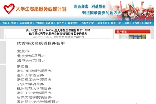 2013年7月24日,《中国青年报》在第六版“共青视点”中公布“2012-2013年度大学生志愿服务西部计划绩效考核优秀等次项目办名单”,我院项目办获评全国大学生志愿服务西部计划“优秀项目办”。全国共有211所高校获此殊荣,高职院校仅10所,我院是浙江省唯一一所高职院校。